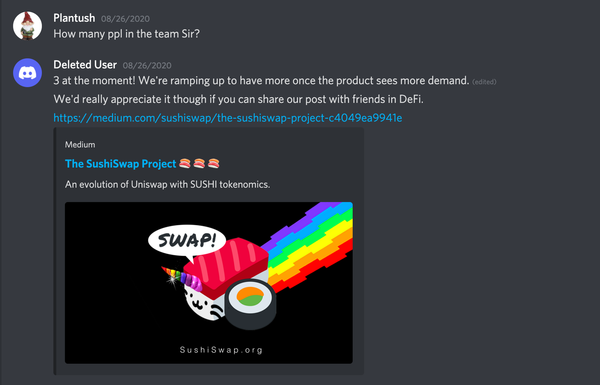 Nomi was not the only high-profile departure from Sushi during its first 12 months. One early community member noted that the project seemed to have two founders at inception. They pointed to a since-deleted user peppering early conversations: